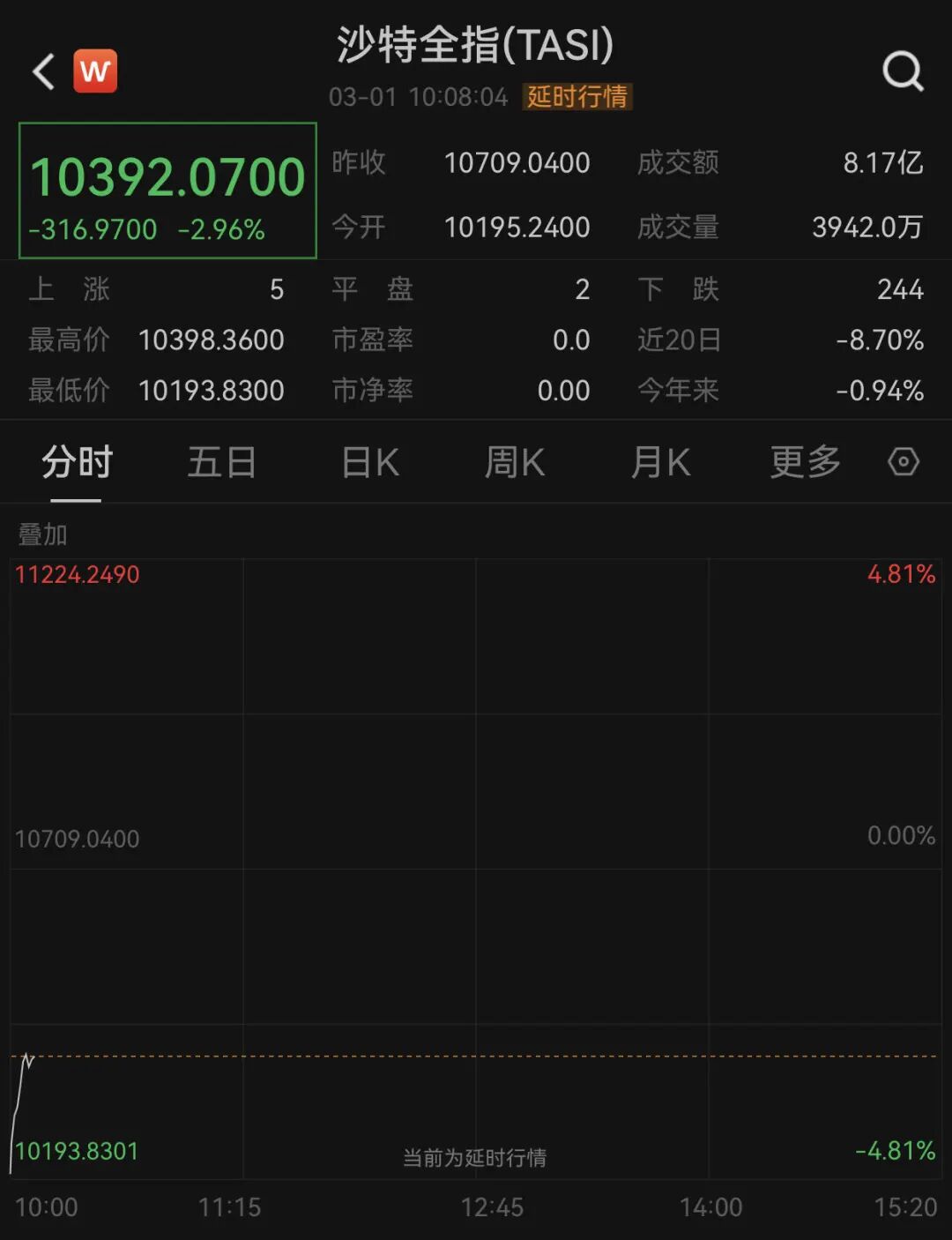 3月1日,中东股市开盘大跌,沙特全指(TASI)早盘一度跌近5%,随后跌幅有所收窄,截至发稿,该指数跌幅为2.96%。