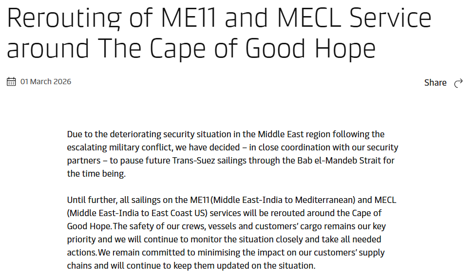 此外,马士基3月1日发布中东—印度至地中海航线(ME11)及中东—印度至美国东海岸航线(MECL)改道好望角通告。马士基称,鉴于中东地区军事冲突升级导致安全形势持续恶化,经与安全合作伙伴密切协调,决定暂时暂停未来经曼德海峡的苏伊士运河航线。即日起,所有ME11及MECL航线将改道好望角航行。
