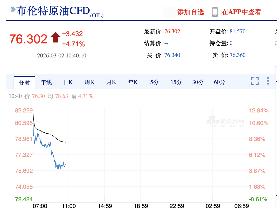 随着美以伊新一轮冲突爆发,中东局势骤然升级,国际油价大涨。3月2日,布伦特原油开盘大涨13%,至82美元/桶。截至发稿前,其价格回落至76美元/桶,涨幅为4.71%。