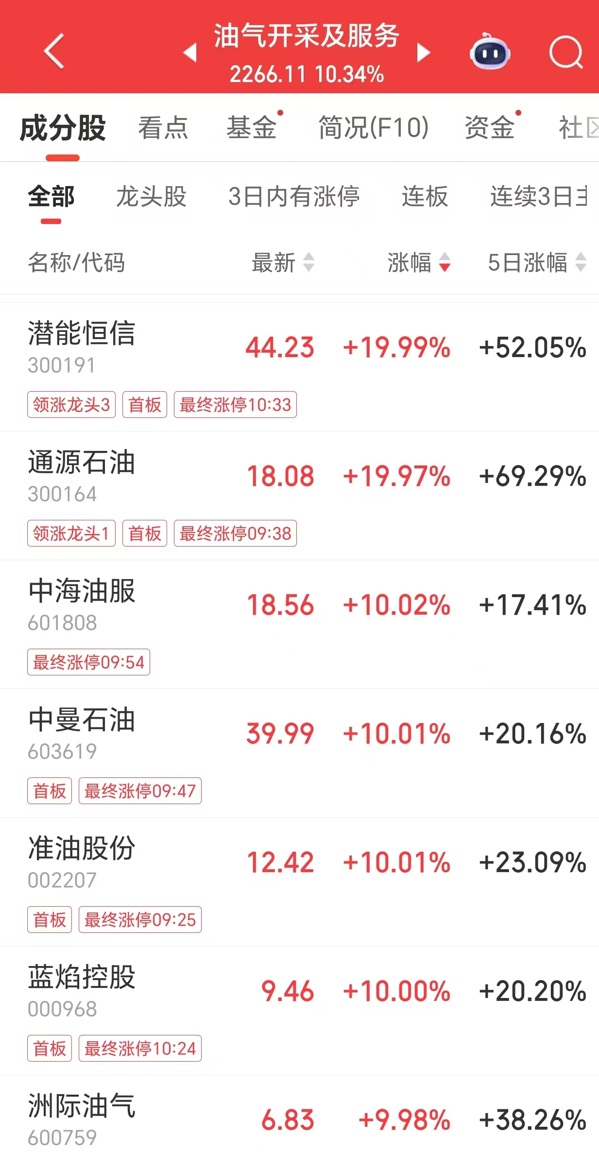 同日,国内油气板块掀涨停潮。潜能恒信、通源石油、中海油服、中曼石油、准油股份、蓝焰控股、洲际油气等多股涨停。此外,中国石油上涨6.72%,中国石化上涨2.63%,中国海油上涨9.92%。