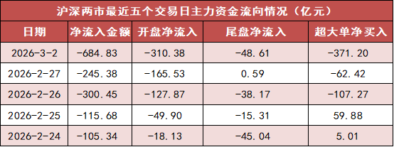 今日沪深两市主力资金开盘净流出310.38亿元,尾盘净流出48.61亿元,两市全天主力资金净流出684.83亿元。