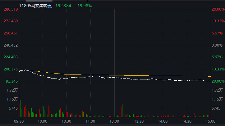 今日,安集转债在披露提前赎回的公告后,价格出现大跌情形。今日开盘,安集转债跌15.15%,随着市场行情走弱,该转债的价格继续下探,一度触及跌停,最终收盘大跌19.98%,报192.384元/张。