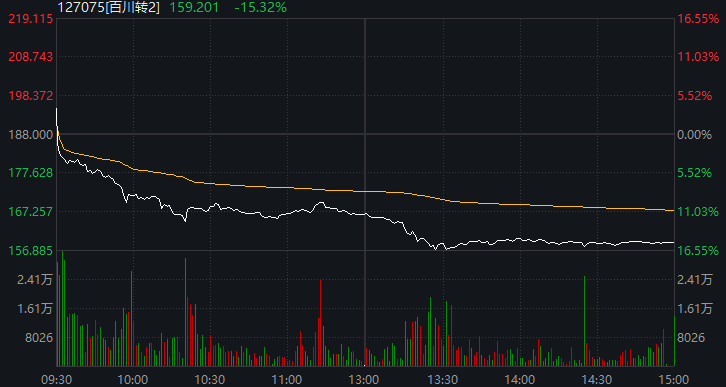 无独有偶,百川转2也出现同样一幕。行情数据显示,今日开盘,百川转2高开3.84%,但随后该转债的价格持续下跌,收盘时的跌幅达15.32%。百川转2对应的正股百川股份开盘后持续下跌,并在开盘后不久封住跌停板,正股价格下跌影响转债投资者信心,百川转2收盘时的转股溢价率为-3.86%。