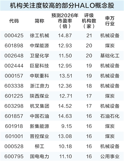 据证券时报·数据宝统计,10家及以上机构评级个股中,筛选后有29股(属于石油石化、煤炭、有色、化工等HALO交易相关板块)按照2026年机构一致预测净利润计算的市盈率低于15倍。其中,华能国际前瞻市盈率最低,为8.01倍。此外,华电国际、新集能源、东航物流等个股前瞻市盈率均低于10倍。