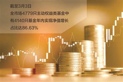 Wind资讯数据显示,截至3月3日,全市场4779只(仅统计主代码)主动权益类基金中,有4140只基金年内实现净值增长,占比达86.63%。