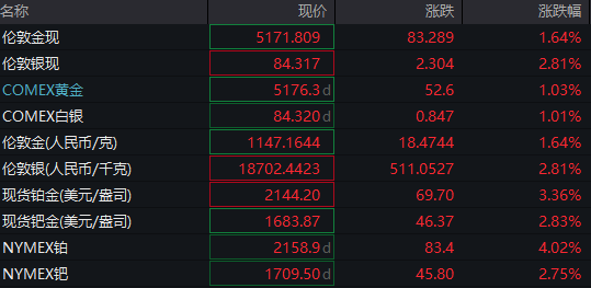 贵金属市场全线走高,现货黄金涨超1.6%,现货白银涨近3%。