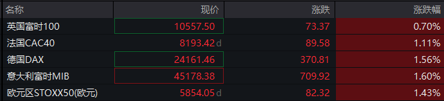 当天,欧洲主要股指反弹,截至发稿,英国富时100指数涨0.7%,法国CAC40指数、德国DAX指数、意大利富时MIB指数、欧元区STOXX50指数均涨超1%。