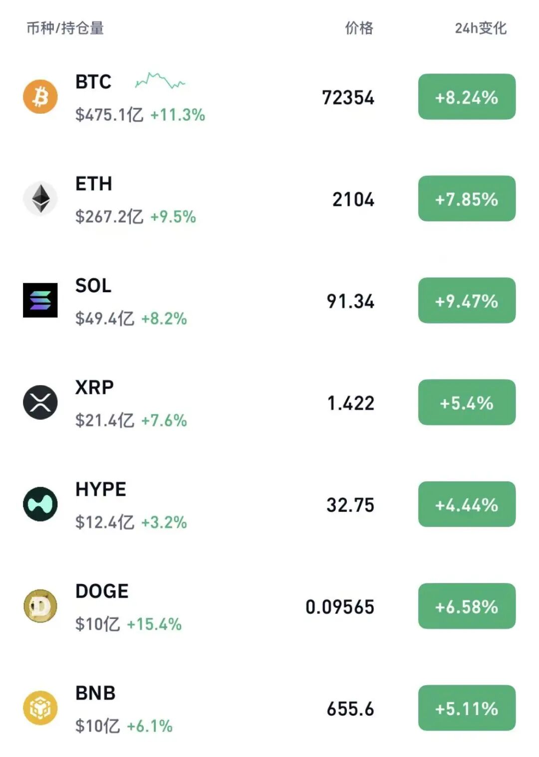 此外,加密货币全线走高,比特币涨超8%,站上72000美元关口,以太坊涨超7%,SOL涨超9%。CoinGlass数据显示,最近24小时内,加密货币市场共有12万人爆仓。
