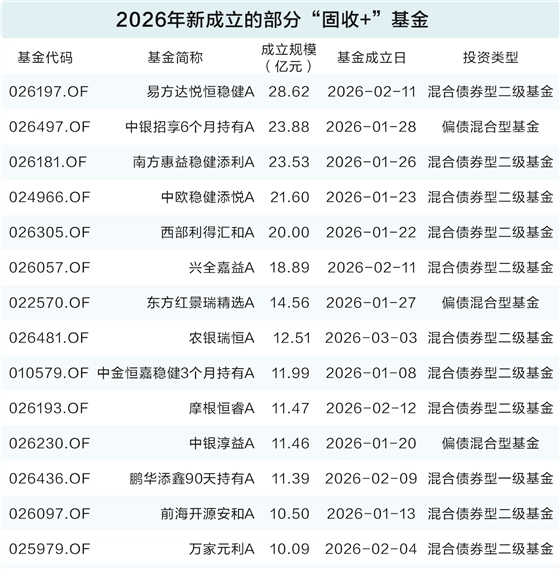 Wind数据显示,截至3月4日,2026年以来新成立了30只“固收+”基金,合计发行规模已经超过300亿元,其中,易方达悦恒稳健、中银招享6个月持有、南方惠益稳健添利等多只“固收+”基金首募规模超20亿元。