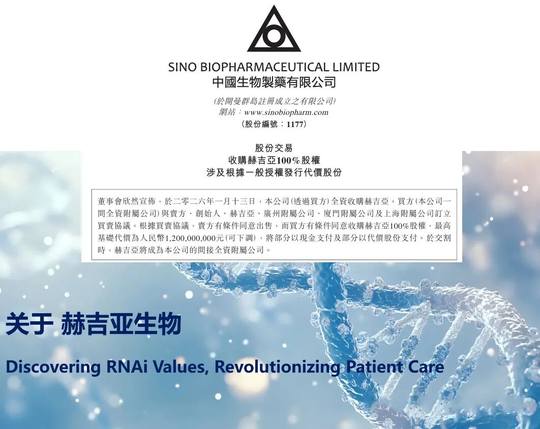 2026年初,她宣布以12亿元总价,全资收购国内siRNA创新药企赫吉亚生物。