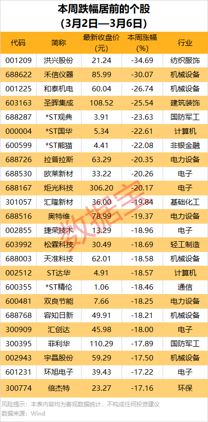 本周累计下跌的个股中,302股跌幅在10%以上,洪兴股份一周累计跌34.69%,居首;禾信仪器、和泰机电、圣晖集成等累计跌幅均超25%。