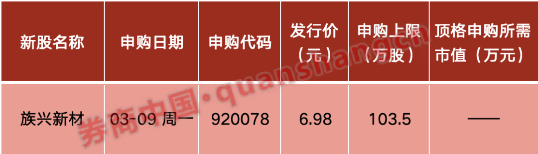 本周(3月9日—3月13日)有1只新股发行,周一:族兴新材。