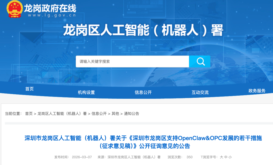 近日,深圳市龙岗区人工智能(机器人)署公布了《支持OpenClaw&OPC发展的若干措施(征求意见稿)》(下称《若干措施》),拟抢抓人形机器人量产元年及具身智能爆发机遇,拓展“一人公司”生态。