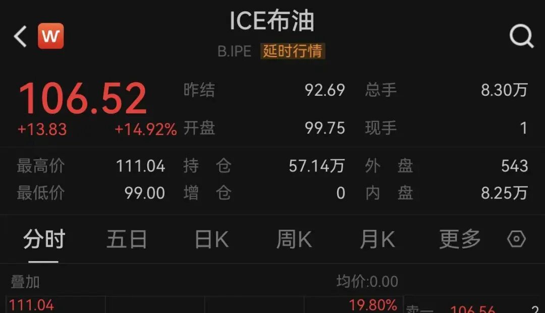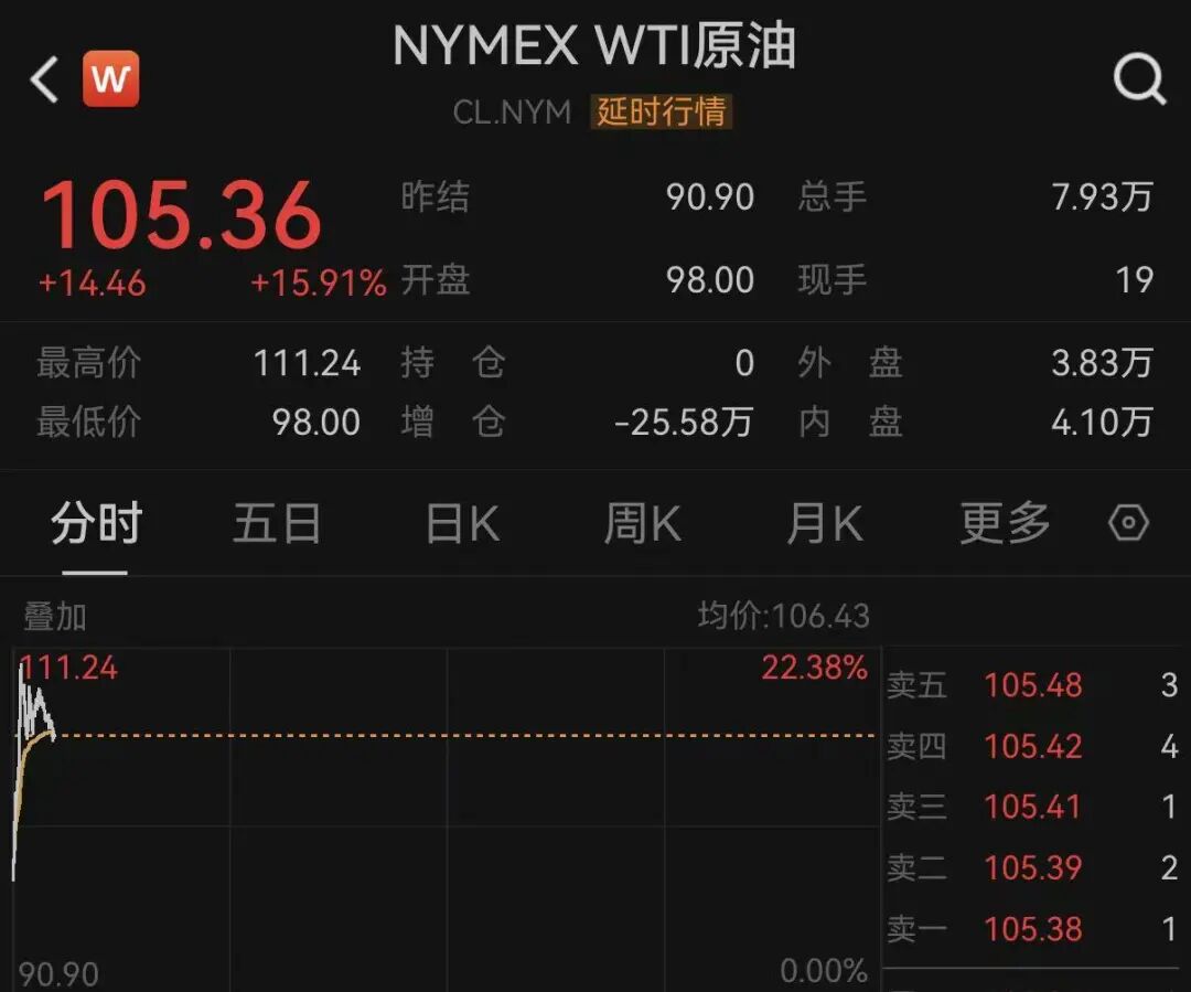 原油方面,受中东局势影响,NYMEX WTI原油暴涨近16%,每桶价格突破105美元大关,ICE布油也暴涨近15%,每桶价格突破106美元。