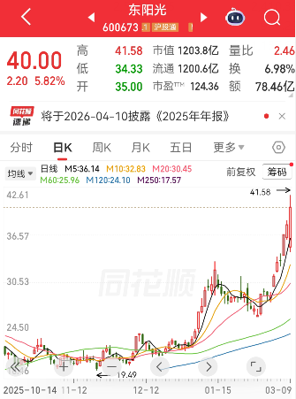 人民财讯3月9日电,近日,东阳光(600673)股价持续走强。3月9日,该股盘中触及涨停板,收盘涨幅5.82%,最新收盘价40元/股,创下历史新高,公司最新A股市值突破1200亿元。