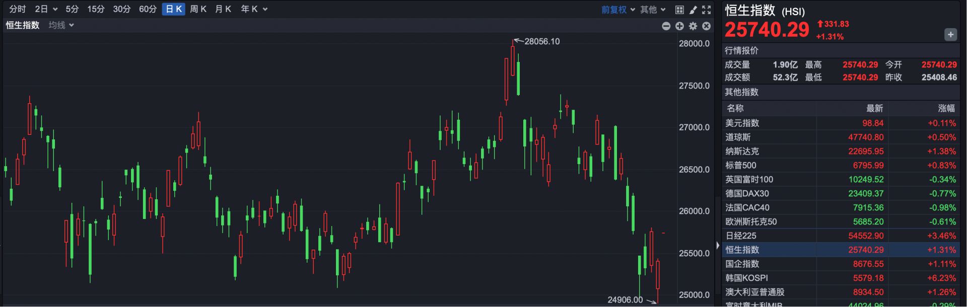 截至发稿,恒生指数开盘报25740.29点,上涨331.83点,涨幅1.31%。