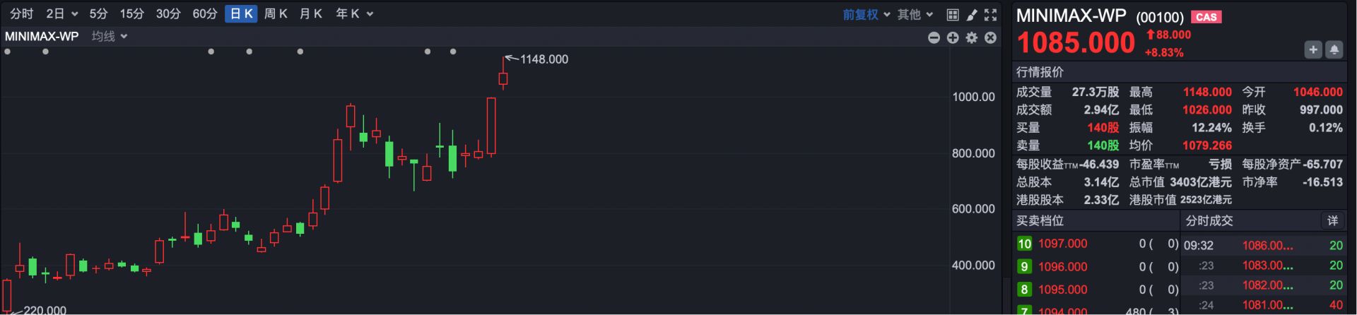 焦点公司方面,MiniMax(00100)高开高走,股价突破1000港元大关。截至发稿,MiniMax一度涨超15%,股价最高涨至1148港元,进一步巩固港股第一高价股地位,市值突破3400亿港元。