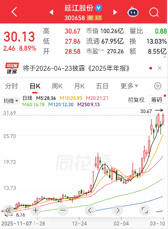 人民财讯3月10日电,3月10日午后,延江股份(300658)一度涨超10%,股价最高触及30.67元/股,创下历史新高。