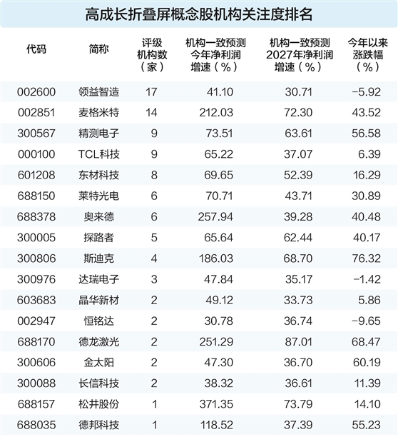 A股市场折叠屏概念股合计有110多只,其中领益智造、麦格米特、精测电子等概念股获机构一致预测今明两年净利润增速均超30%。