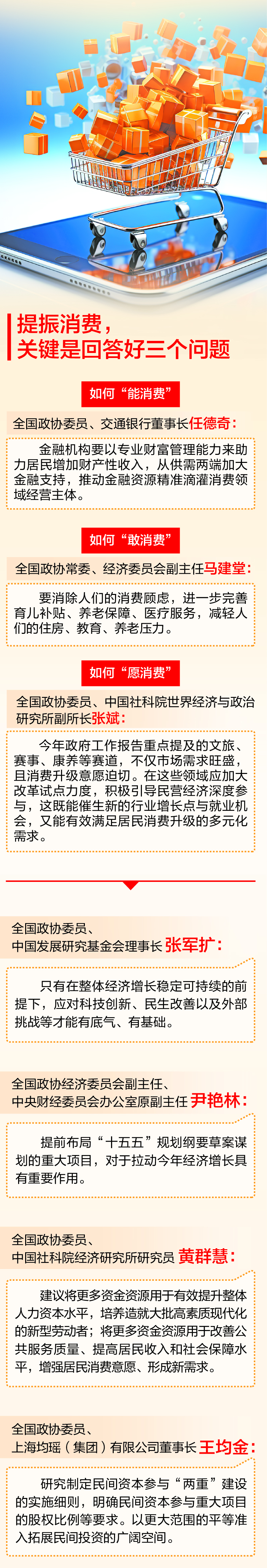 提振消费,关键是回答好三个问题——如何让群众“能消费、敢消费、愿消费”。今年政府工作报告将“深入实施提振消费专项行动”置于优先位置,提出制定城乡居民增收计划,要求落实职工带薪错峰休假制度,部署服务消费提质惠民行动。