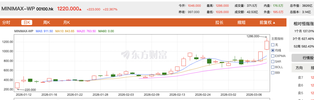 3月10日收盘,MiniMax(00100.HK)股价上涨超过22%,市值站上3826亿港元,在中国上市企业市值榜中排到51位;而百度(09888.HK)今日涨幅为2.9%,市值为3322亿港元,两者市值拉开了约500亿港元的差距。