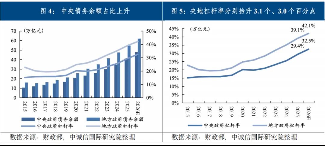 2023年10月召开的中央金融工作会议,首次提出优化中央和地方政府债务结构。2024年开始,中央财政加杠杆力度明显加大,其中2025年和2026年新增政府债务规模中,国债规模超过了地方政府债券。