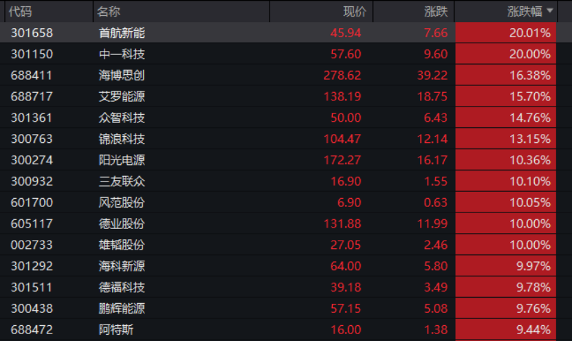 若按照申万一级行业划分,电力设备板块大涨,板块盘中涨幅超过3%,板块内个股则掀起涨停潮,首航新能、中一科技“20cm”涨停,海博思创、众智科技一度触及“20cm”涨停,风范股份、德业股份、雄韬股份涨停。