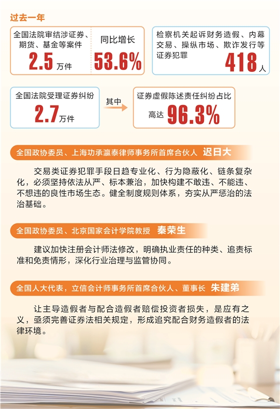 全国两会期间,多位代表委员聚焦资本市场法治建设,建议推动证券法、注册会计师法的修订与完善,加快出台更多司法解释,加大证券违法犯罪行为惩戒力度、健全第三方追责链条、畅通投资者维权渠道,以法律法规的完善切实保护中小投资者合法权益。
