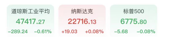 美国股市周三涨跌互现,投资者谨慎关注中东局势与油价飙升,同时关注最新通胀数据。截至收盘,道指下跌289.24点,跌幅0.61%,收于47417.27点,纳斯达克综合指数小幅上涨0.08%,收于22716.13点。标普500指数微跌0.08%,收于6775.80点。