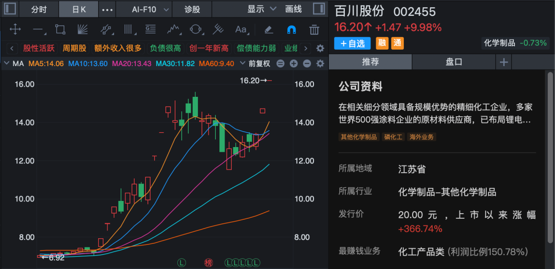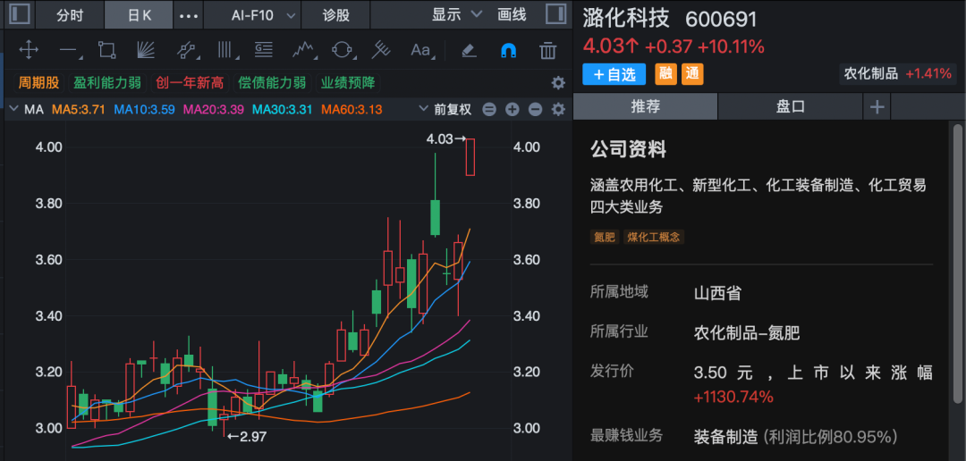 化工股承继昨日午后强势继续走高,化学原料方向再度领涨,板块指数高开高走,盘中一度放量涨逾4%,创四年半来新高。百川股份开盘一字涨停,连续第2日封板;潞化科技高开后秒速涨停,金煤科技、金能科技等也纷纷强势涨停。