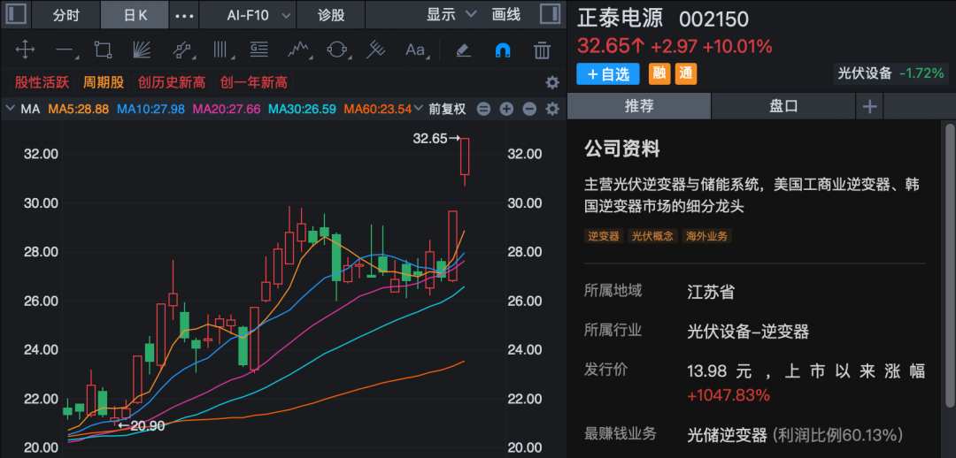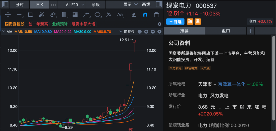 新能源产业近来也频频活跃,风电板块指数早间创历史新高。绿发电力开盘仅约1分钟涨停,连续第3日封板;正泰电源也仅约7分钟涨停,连续第2日封板,股价创历史新高(复权);金时科技、大唐发电等均强势涨停。