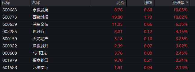 房地产板块涨幅居前,板块涨幅超过1%,京投发展、西藏城投涨停,另有浦东金桥、世联行等多股跟涨。