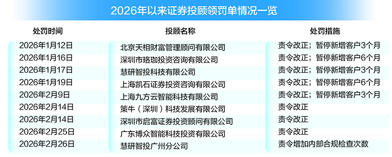 据同花顺iFinD数据统计,2025年,共有46家证券投资咨询机构被监管部门处罚56次(含行政处罚和行政监管措施),同比增长36.59%,其中,两家机构因为严重违规被直接吊销牌照。进入2026年,严监管持续,已经有北京天相财富、九方智投、慧研智投等8家行业知名机构受到处罚,有的甚至被暂停新增客户。