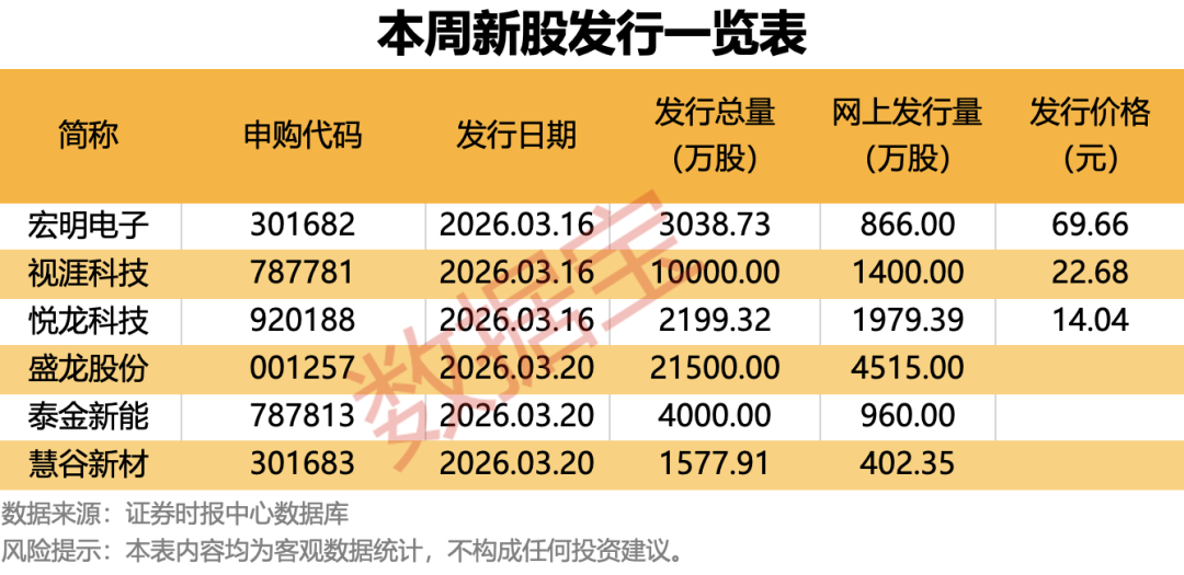 根据发行安排,本周暂有6只新股申购,日程安排上,今日(3月16日)可申购宏明电子、视涯科技、悦龙科技,本周五可申购盛龙股份、慧谷新材、泰金新能。