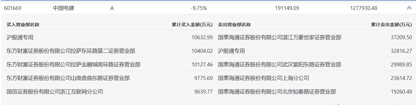 人民财讯3月16日电,中国电建今日跌停,成交额127.79亿元,换手率14.62%,盘后龙虎榜数据显示,沪股通专用席位买入1.06亿元并卖出3.28亿元。国泰海通证券湛江万豪世家证券营业部卖出3.72亿元。