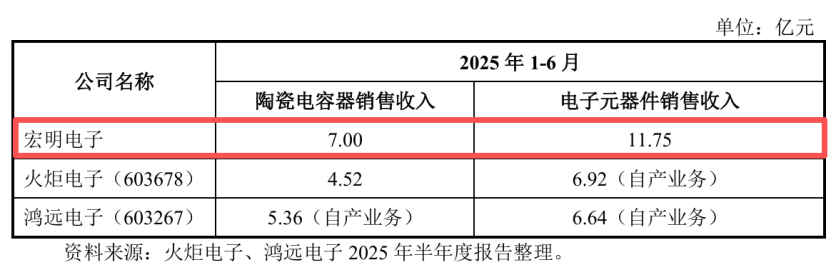 在这个圈子里,宏明电子是国内防务电子元器件核心供应商,尤其在高可靠MLCC(多层陶瓷电容器)和军用有机薄膜电容器等细分市场占据龙头地位。在高可靠产品应用市场,由于资质壁垒及产品高可靠性等要求,产品均为国内企业生产且参与者较少。根据行业数据,在2025年上半年,无论是陶瓷电容器还是整个电子元器件业务的销售收入,宏明电子都跑在了同行前面。