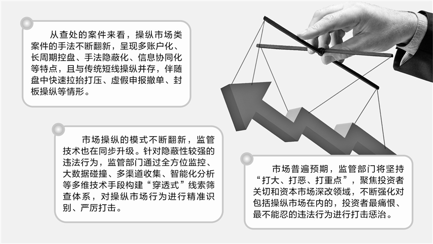 从查处的案件来看,操纵市场类案件的手法不断翻新,呈现多账户化、长周期控盘、手法隐蔽化、信息协同化等特点,且与传统短线操纵并存,伴随盘中快速拉抬打压、虚假申报撤单、封板操纵等情形。