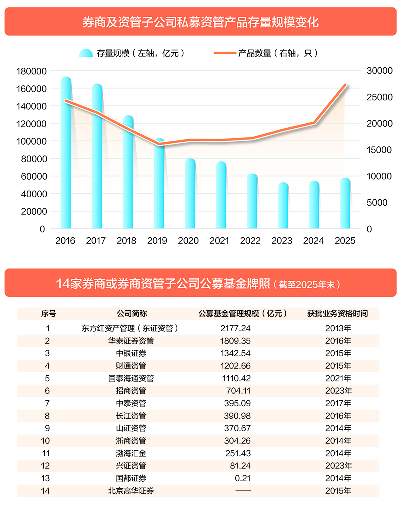 公募牌照仍是关键约束。当前,公募牌照已成为决定机构业务边界、客群覆盖与规模空间的重要变量,短期牌照发放收紧的现实,进一步加剧了行业分层格局。目前,全行业仅有14家券商或券商资管具备公募资质,能够公私募双线并行,充分享受普惠金融与规模扩张带来的发展红利。