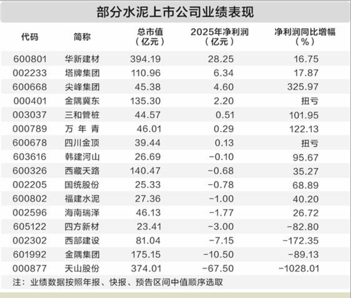 数据宝统计,截至3月17日,已有16家水泥上市公司发布2025年业绩相关报告。以年报、快报或预告区间中值统计,共计7家公司2025年实现盈利。华新建材、塔牌集团、尖峰集团、金隅冀东4家净利润超亿元,依次为28.25亿元、6.34亿元、4.6亿元、2.2亿元。