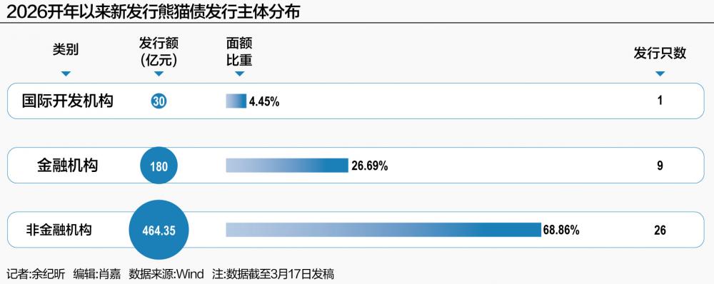发行主体方面,21世纪经济报道记者据Wind数据梳理发现,2026年开年以来,非金融机构发行额464.35亿元,面额比重68.86%;金融机构发行额180亿元,占比26.69%;国际开发机构发行额30亿元,占比4.45%。