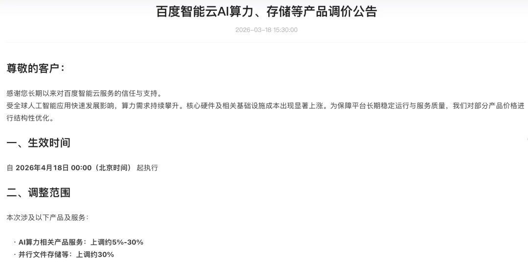 值得一提的是,在3月18日阿里云宣布涨价之后数小时,百度智能云迅速跟进,其在公告中明确表示,调价原因是 “受全球人工智能应用快速发展影响,算力需求持续攀升”,调整范围同样聚焦 AI 算力产品和文件存储 —— 其中,AI 算力相关产品服务上调约 5%—30%,并行文件存储等上调约30%。