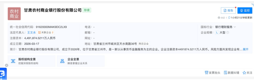 天眼查信息显示,3月17日,甘肃农村商业银行股份有限公司(以下简称“甘肃农商银行”)正式完成工商注册登记,注册资本为449.19亿元。
