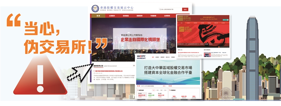 类似“香港股权交易展示中心”这样的“李鬼”网站并不少,仅证券时报记者查询就发现还有“香港全球股权交易中心”“香港科技创新股权转让市场”“香港股权交易中心”等。而这些“伪交易所”往往在LOGO、名称上都“碰瓷”香港交易所或是内地交易所。
