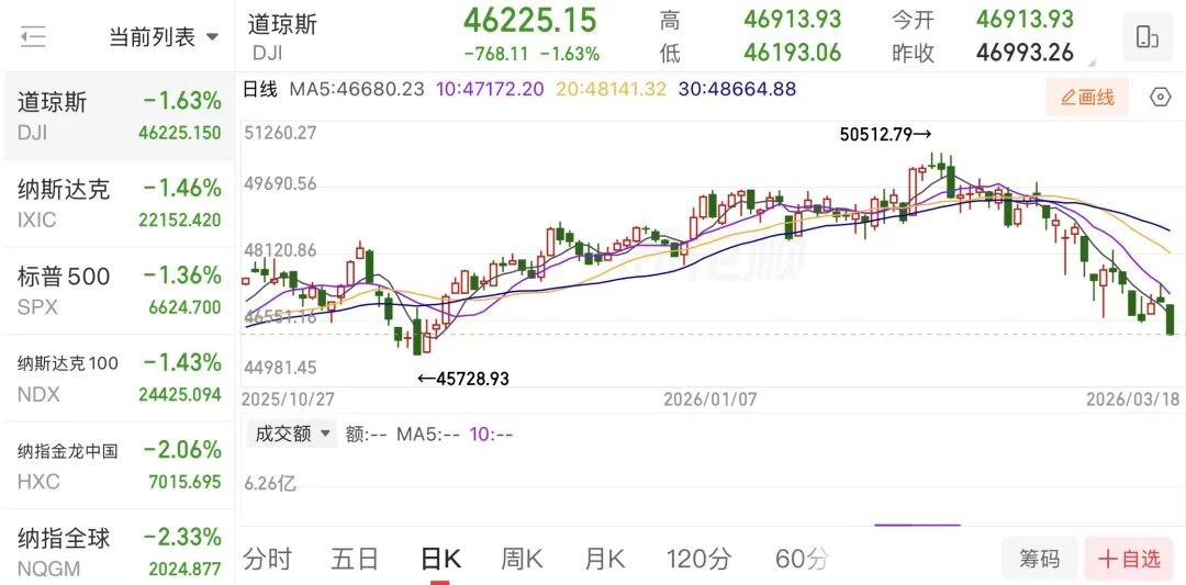 当天,美股三大指数集体下跌,截至收盘,道指跌1.63%,报46225.1点;标普500指数微跌1.36%,报6624.7点;纳斯达克指数跌1.46%,报22152.42点。