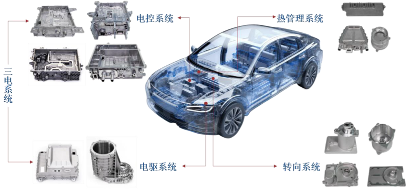 近年来,公司精准把握汽车新能源化和轻量化的战略发展机遇,新能源汽车三电系统零部件产品已成为公司业绩增长的重要驱动力,其产品主要包括OBC 箱体、车载电源集成产品箱体和端盖、逆变器壳体、电机盖板等。
