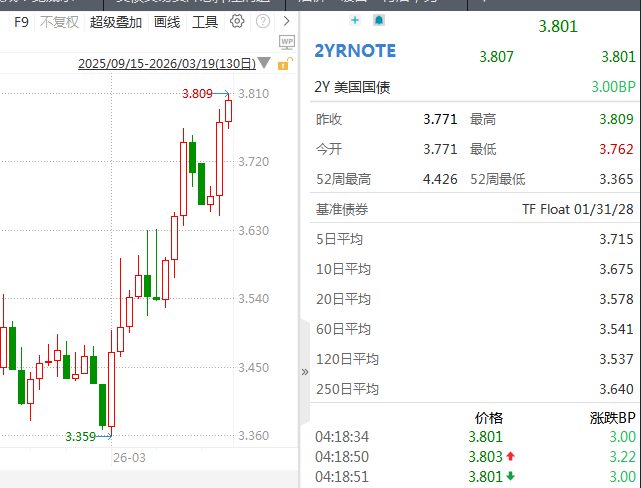 受上述消息影响,美债在经历了3月初的大跌后,近两个交易日再遭重挫,短期美债的跌幅更为明显。行情数据显示,2年期美债期货价格在3月18日跌0.21%后,3月19日盘中的跌幅仍在0.1%以上。而2年期美债收益率已飙升至3.8%的上方,创去年8月以来新高。