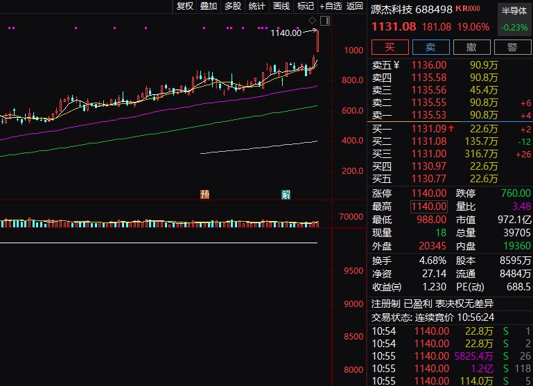 3月20日,近期市场的人气股源杰科技股价成功突破1000元,盘中最高达到1140元,创出该股历史新高,成为A股市场又一只千元股,这也是2026年以来A股市场首只新晋千元股。