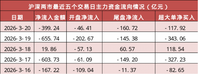 今日沪深两市主力资金开盘净流出46.41亿元,尾盘净流出160.72亿元,两市全天主力资金净流出399.24亿元。