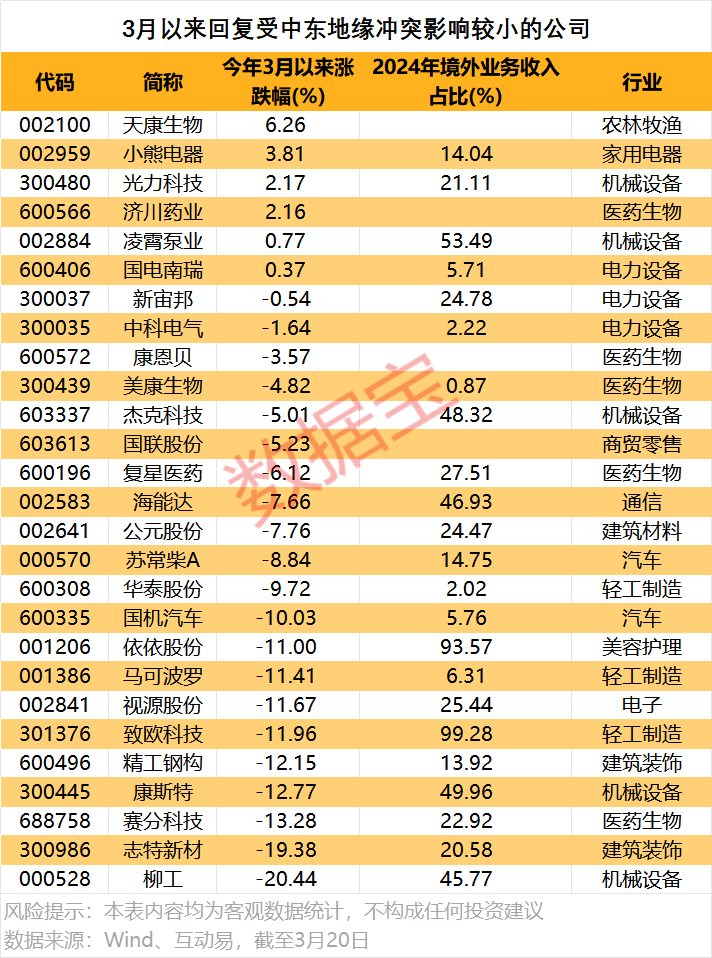 据证券时报·数据宝统计,3月以来,50余家公司在投资者关系互动平台回复影响情况或影响程度。整体来看,10余家公司表示,中东地缘冲突对公司业务有影响,但影响呈现双向性,既有正面也有负面;近30家公司回复影响较小;其余公司回复无影响,包括四川九洲、卫星化学、建霖家居、思瑞浦等。