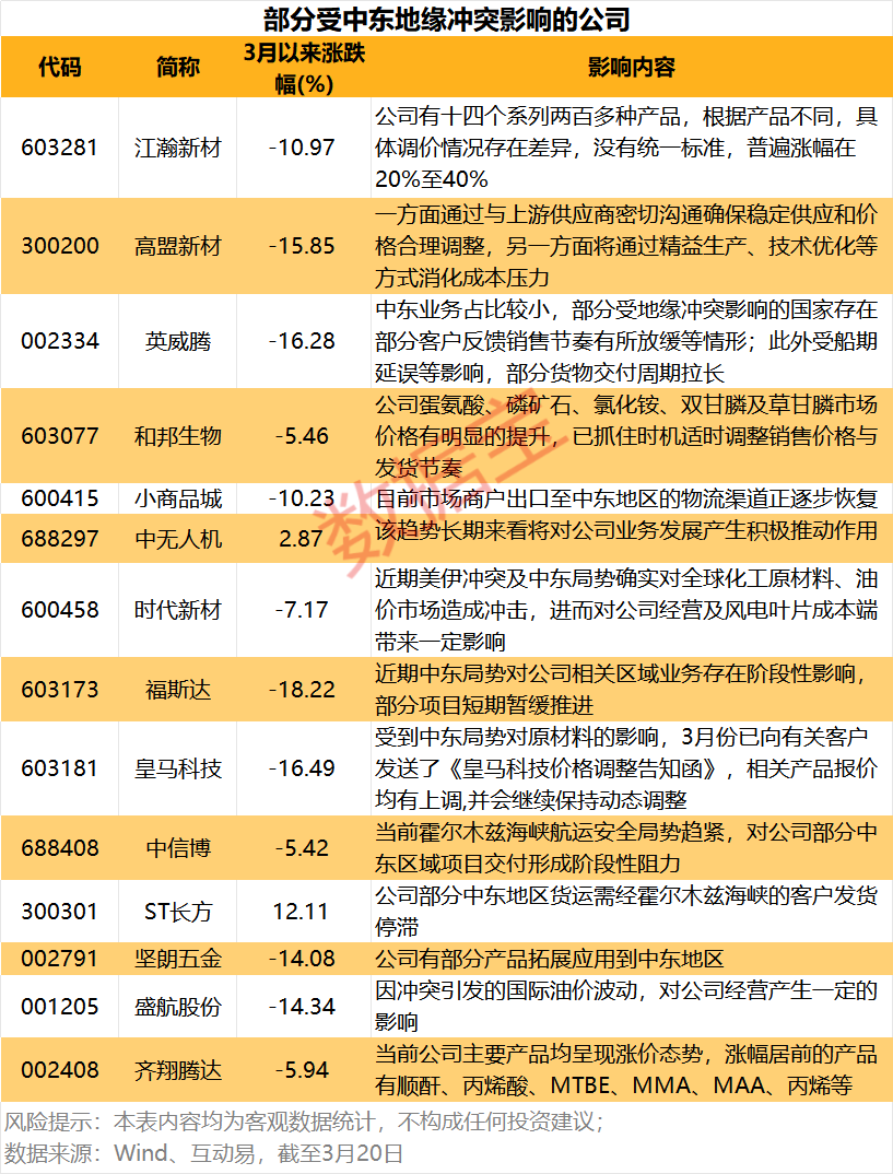 人民财讯3月23日电,中东地缘冲突持续升级,霍尔木兹海峡航运受阻,石油化工、钢铁建材、有色金属以及航运等多个行业板块均受到不同程度影响。3月份以来,投资者最为关心“公司是否有产品销往伊朗或者中东”“中东局势对公司影响如何”等,上市公司通过公开渠道积极回复关切。